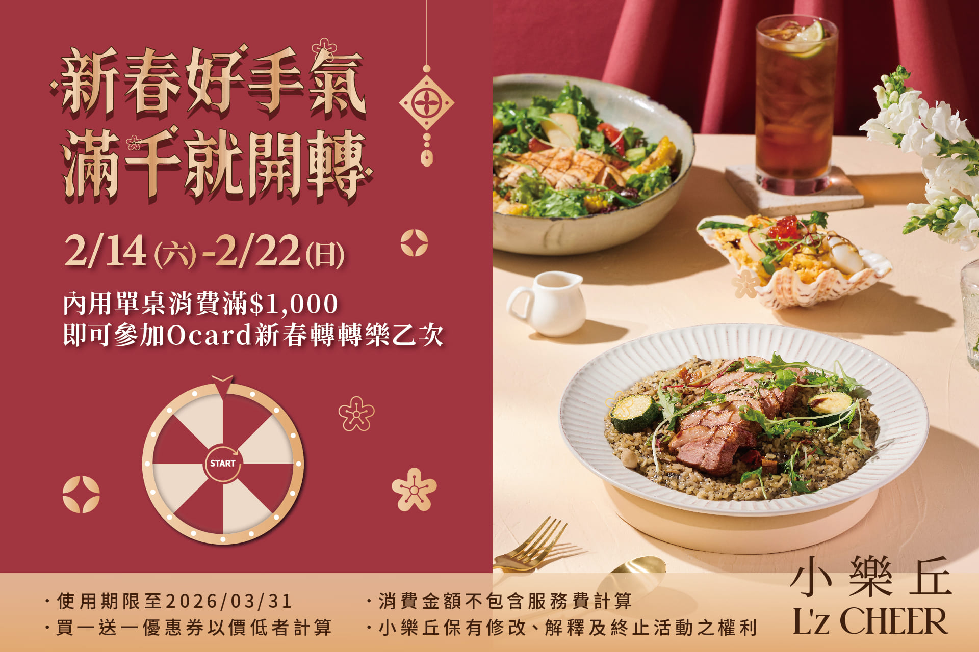 於2/14(六)-2/22(日),內用單桌消費滿 $1,000,即可參加新春轉轉樂